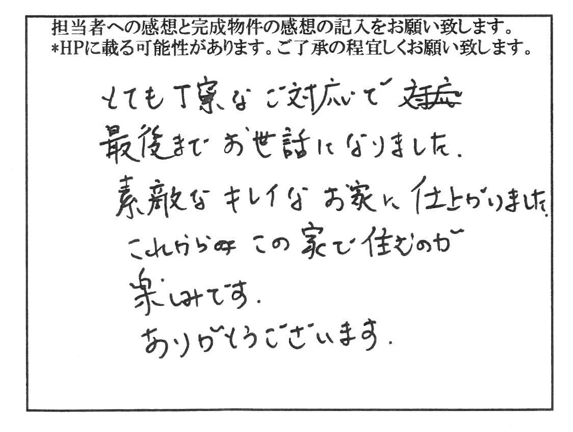 - 細かい事にもその都度ご対応頂き本当に感謝しています。アドバイスも適確に頂き無事ステキな家に住む事ができてうれしいです。