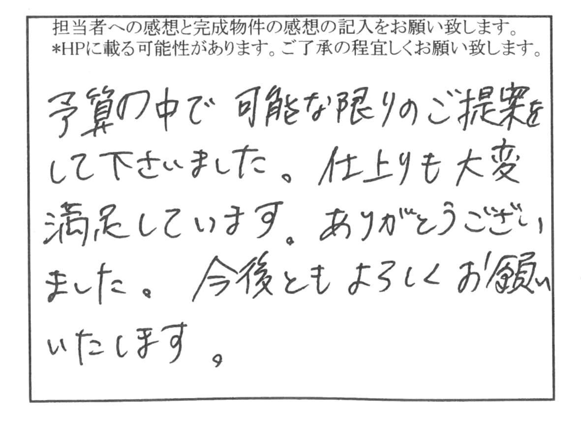 - 予算の中で可能な限りご提案を下さいました。 仕上がりも大変満足しています。ありがとうございました。今後ともよろしくお願いいたします。