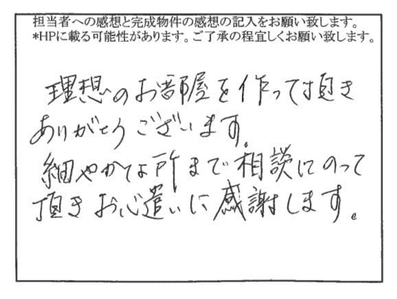 - 親身に対応くださってありがとうございました。 こちらの希望を多く叶えていただき、気に入ったマイホームになりました。