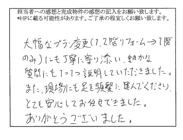 - 大幅なプラン変更(1,2階リフォーム→1階のみ)にも丁寧に寄り添い、細かな質問にも1つ1つ説明していただきました。また現場にも足を頻繁に運んで下さりとても安心してお任せできました。ありがとうございました。