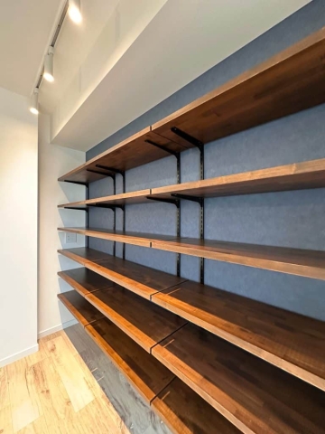 このお住まいでは、壁一面にオリジナルの棚を造作することで、“飾る”ことが楽しめる空間に生まれ変わりました。深いネイビーの壁と木の質感が調和し、飾るもの一つひとつが引き立つ背景に。