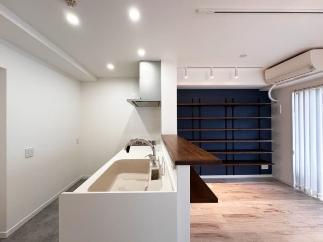 キッチン横の壁一面に設けた造作棚は、濃紺のアクセントクロスと無垢風の棚板が印象的で、空間の「顔」となる存在です。
