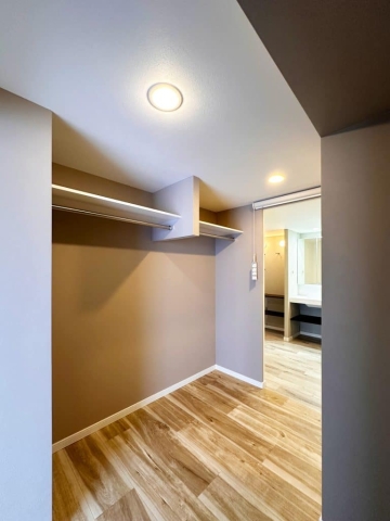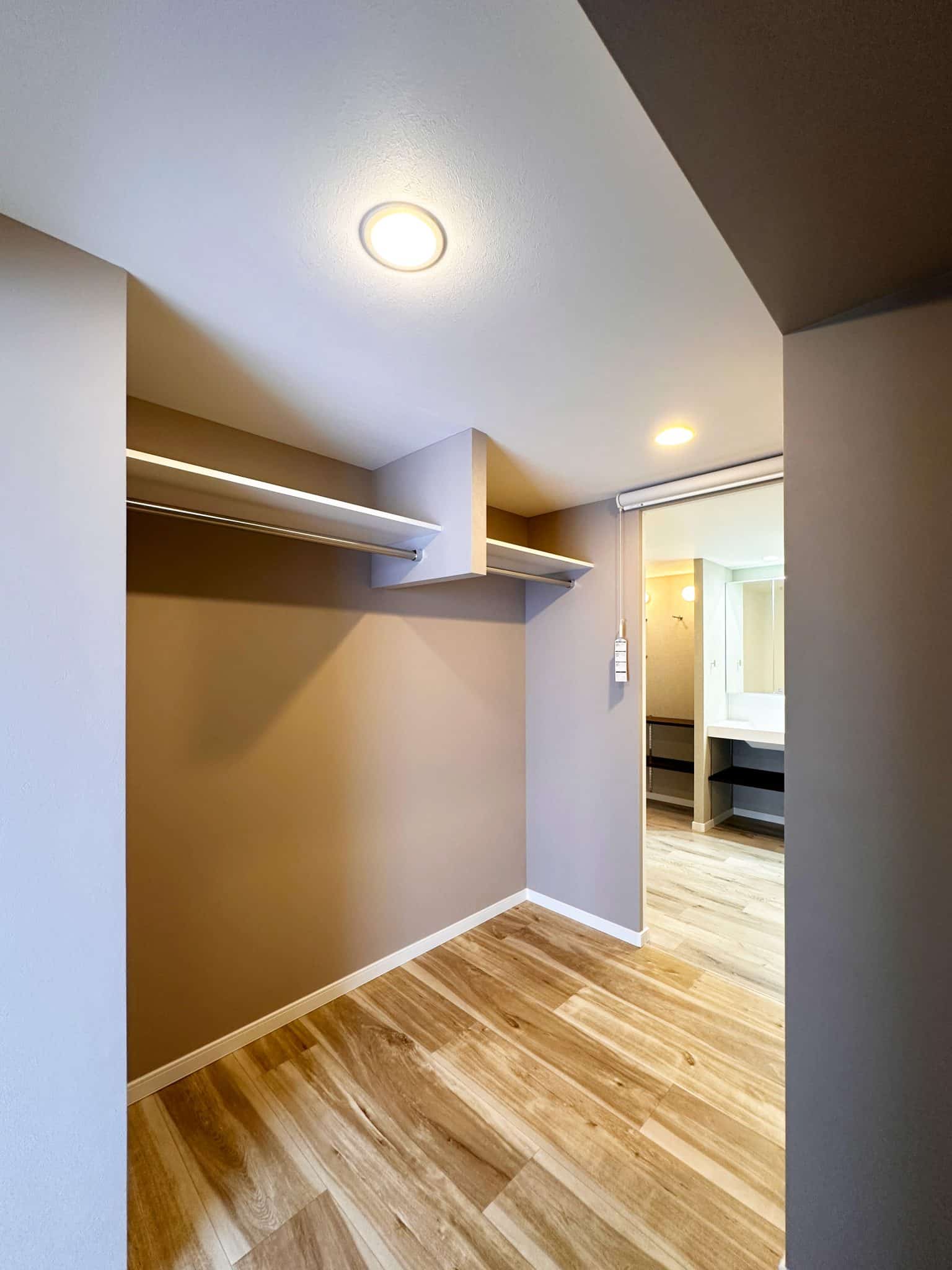 洗面スペースとつながるウォークインクローゼットは、使いやすさと収納力を両立。落ち着いた色味で衣類管理も快適に。