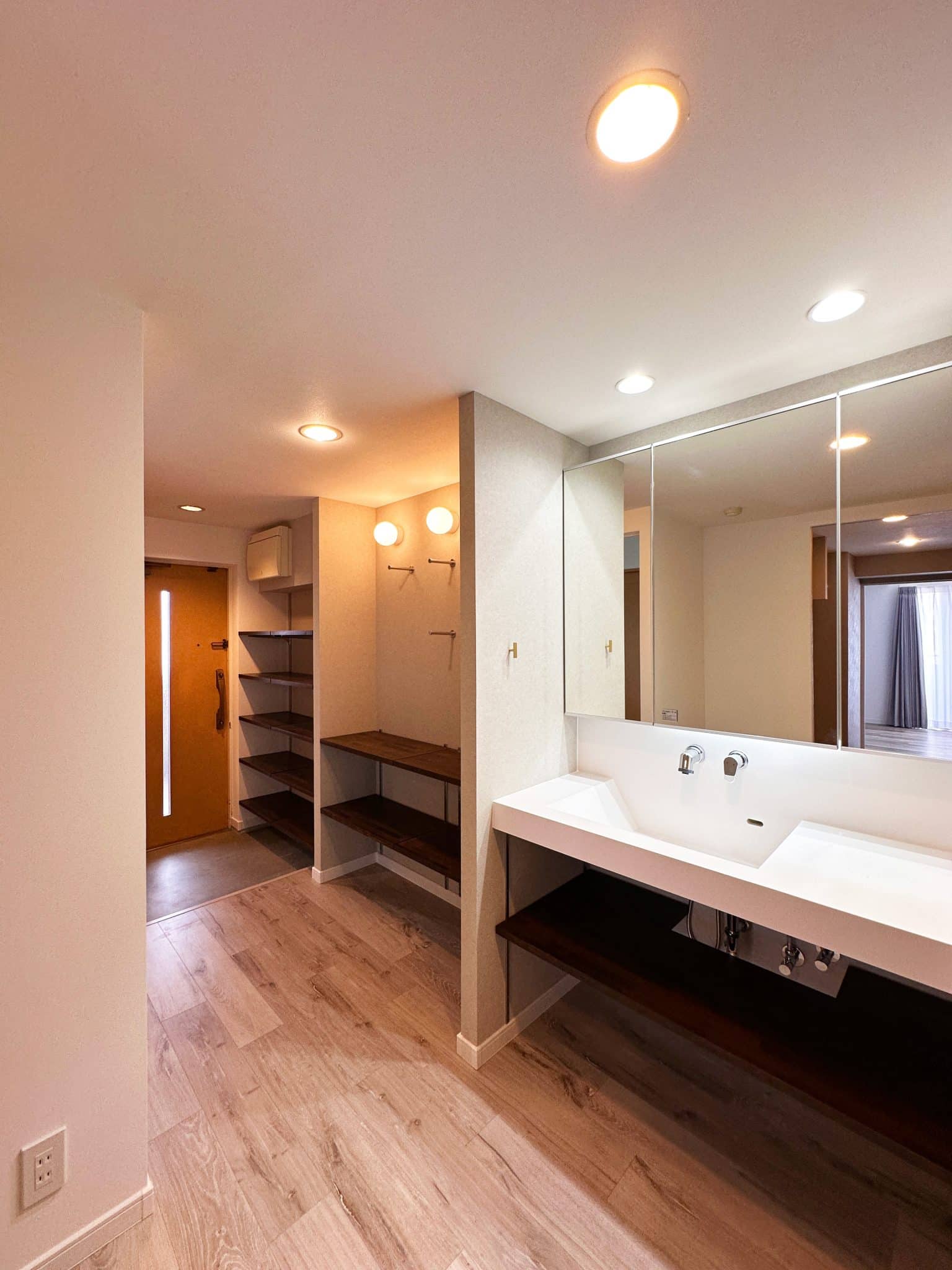 • ワイドミラーを設けたホテルライクなリノベーション洗面室 拡大表示