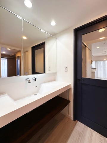 幅広のカウンターと大きな鏡で朝の準備もスムーズに。ネイビーカラーが空間にほどよいアクセントを与えています。
