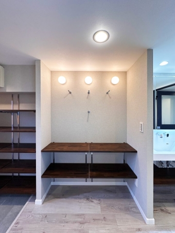 玄関から洗面へとつながる、ゆるやかな動線設計。外から帰ったあとすぐに手洗いができ、暮らしの清潔感と安心感を高めます。